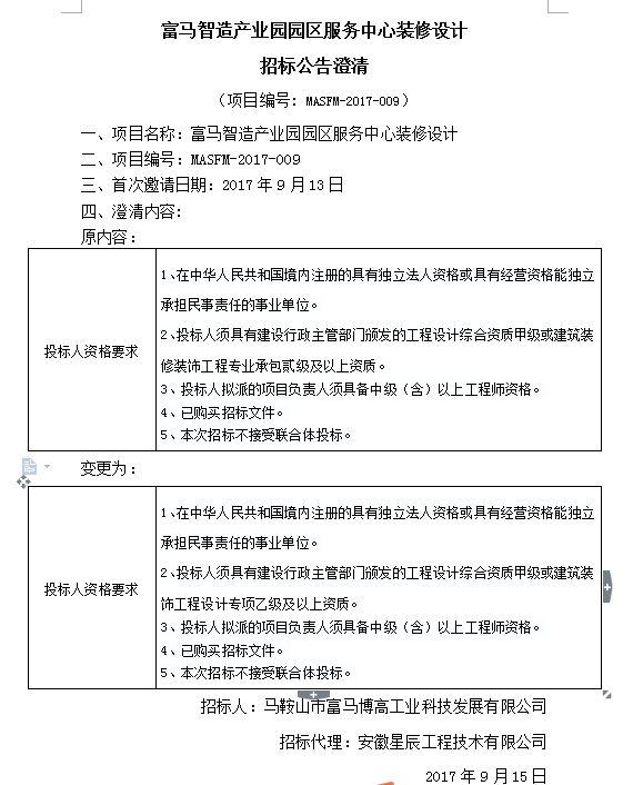 富馬智造產(chǎn)業(yè)園園區(qū)服務中心裝修設計招標公告澄清