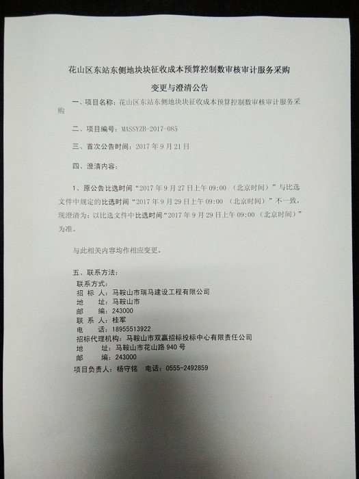 花山區(qū)東站東側(cè)地塊塊征收成本預算控制數(shù)審核審計服務采購變更與澄清公告