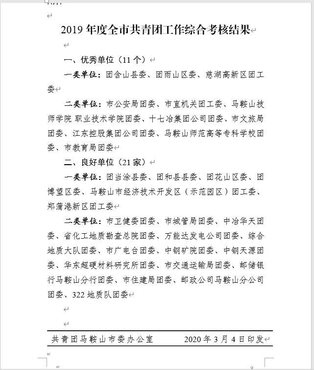 近日,在團市委下發(fā)的《關于2019年度馬鞍山市共青團工作綜合考核結果的通報》中,集團團委再獲“2019年綜合考核優(yōu)秀團組織”榮譽稱號,自2017年全市開展共青團工作綜合考核以來已連續(xù)三年獲此殊榮。
